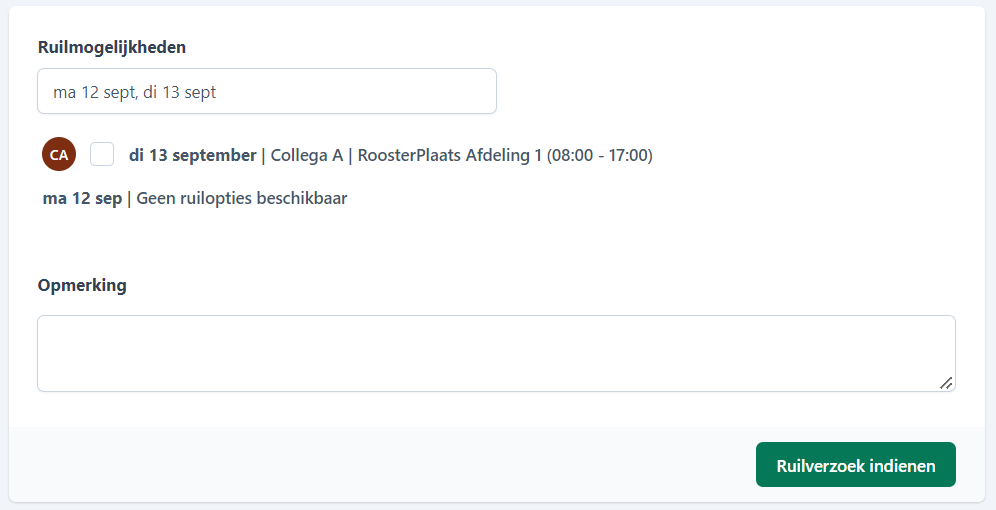 De tool laat automatisch zien, of er overnamemogelijkheden zijn. Selecteer de beschikbare collega's aan wie je wilt vragen om je dienst over te nemen. Dien vervolgens je verzoek in. Het verzoek komt bij je collega en planner terecht. Beiden moeten het verzoek goedkeuren.
